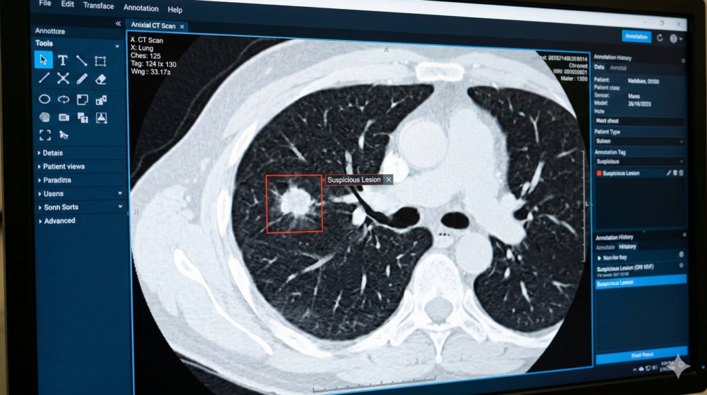 A medical image is labeled with a bounding box around a lung nodule and tagged as suspicious lesion.