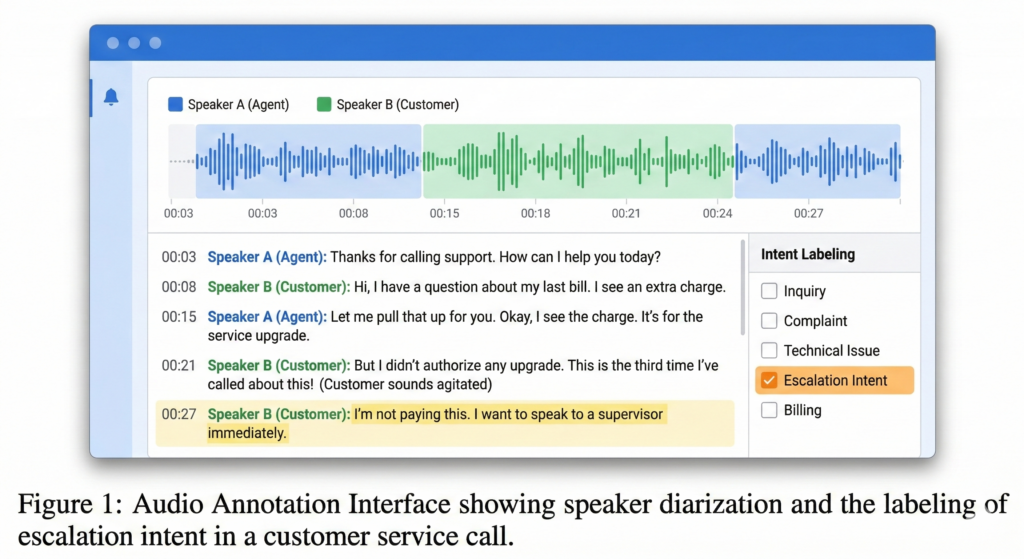 A call recording is transcribed, split by speaker, and labeled for escalation intent.